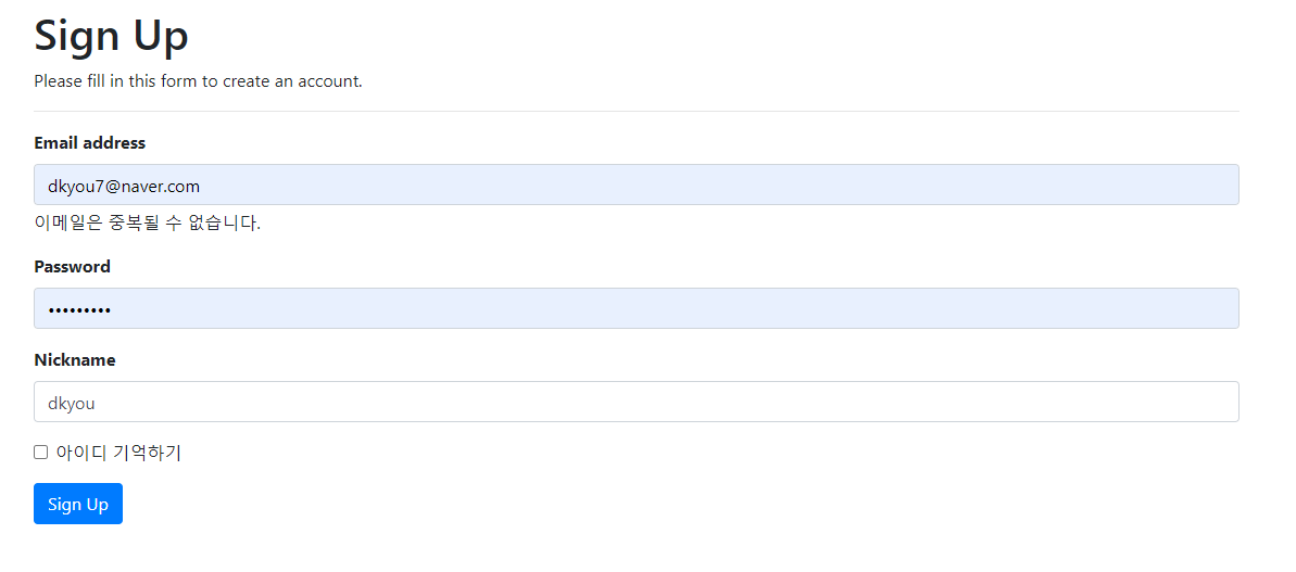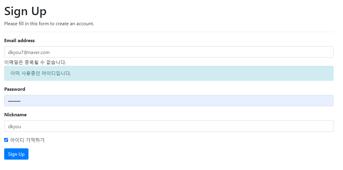 또한, Validator를 구현했기 때문에 똑같은 이메일로 가입하려 했을 때 다음과 같은 창을 볼 수 있습니다.