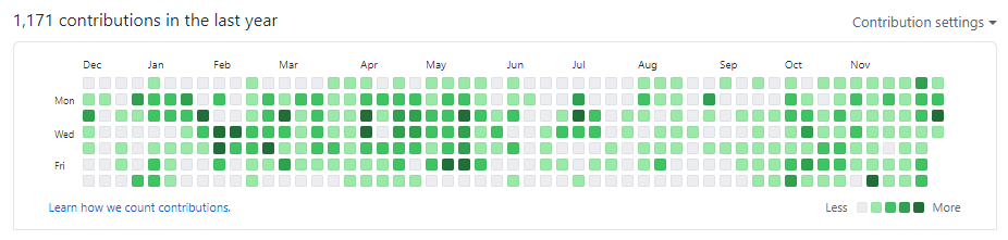 앞서 언급했듯이 내가 1년간 개발자로 살아오면서 중요하게 생각했던 가치관은 "기록남기기" 였다. 깃허브에는 내가 얼만큼 열심히 살았는지를 시각화해주는 기능이 존재하는데, 개발자들 사이에서는 통칭 '잔디심기'로 통한다. 지난 1년간 열심히 잔디를 심었다고 생각했는데, 여름엔 뭘 했는지 몰라도 듬성듬성한 것이 마음이 아팠다. 내년에는 그득한 잔디로 채워지길 바라본다.
