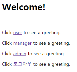 <p sec:authorize="isAuthenticated()">Click <a th:href="@{/logout}">로그아웃</a> to see a greeting.</p>
