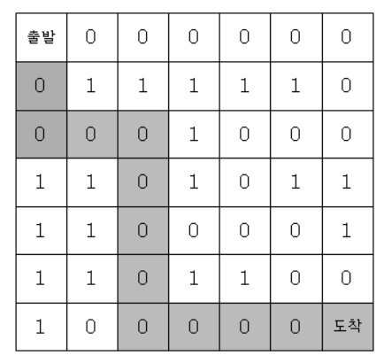 출발점은 격자의 (1, 1) 좌표이고, 탈출 도착점은 (7, 7)좌표이다. 격자판의 1은 벽이고, 0은 통로이다.