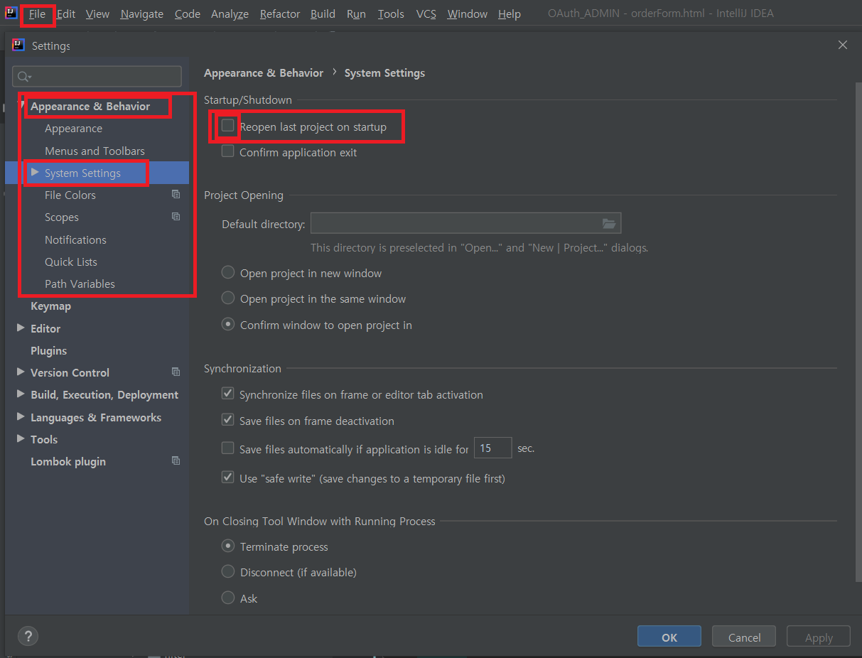 IntelliJ 실행시 최근 종료한 프로젝트 바로 실행되지 않게 하기