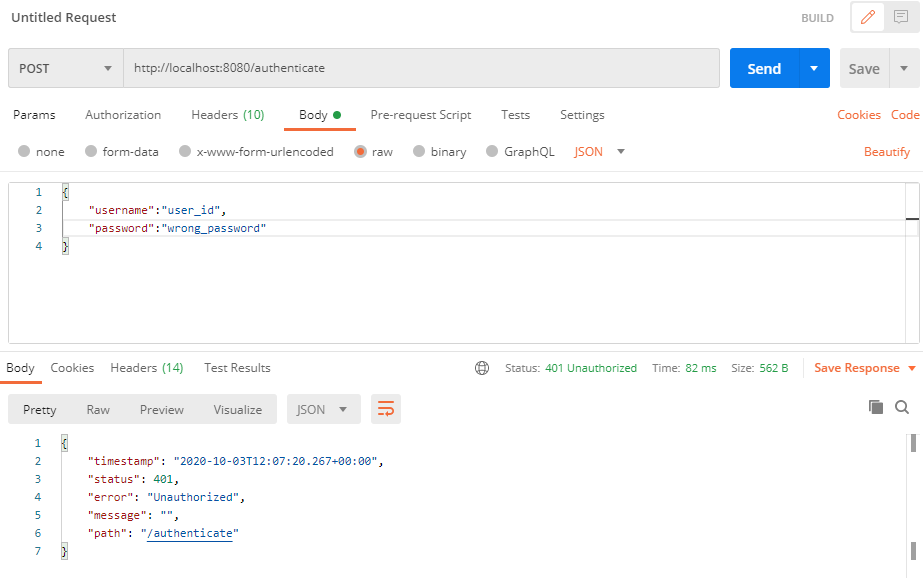- 이번에는 실패하도록 비밀번호를 수정해서 요청을 보내보겠습니다.