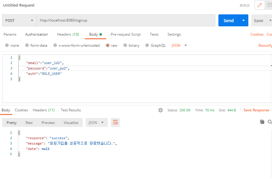 - 주의해야할 것이 있습니다. 회원 가입 시, controller단에서 userDto를 객체로 받기 때문에, 인증시 사용되는 username,password를 이용하면 안됩니다. 커스터마이징한 email,password로 지정해야합니다. 이것을 프론트엔드 개발자와 협의하는 과정이 필요합니다.